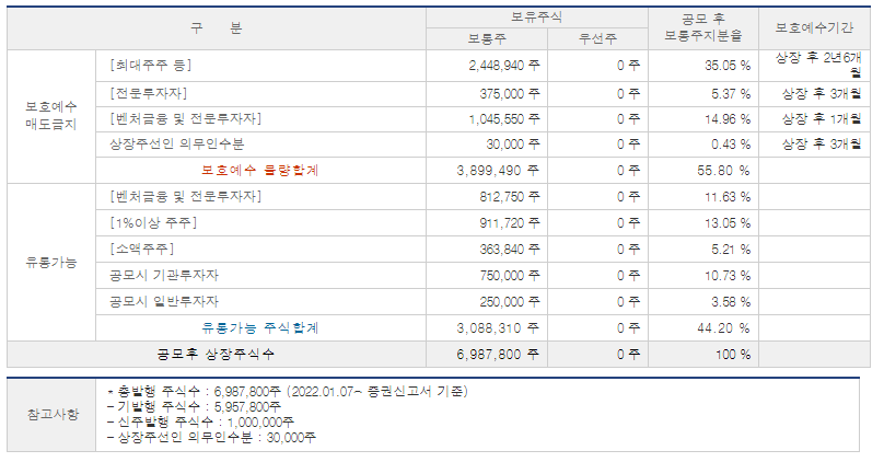 최대주주의 지분율은 35.05%로 상장 후 2년 6개월 보호예수기간이고 상장일 유통가능 주식은 44.20%로 많은 편입니다.