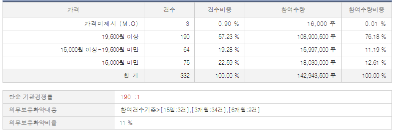 기관투자자 대상 수요예측 결과 공모가 희망 범위 하단인 15,000원으로 결정됐습니다. 전체 공모주 수(100만 주)의 75%인 75만 주를 대상으로 총 332곳이 참여해 경쟁률이 190.59대 1입니다. 의무보유 확약 비율은 19.9%입니다.