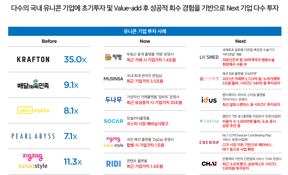 중소기업 창업투자회사로 벤처캐피털 기업입니다. 벤처기업에 자금과 경영서비스 등을 제공하고 추후 인수합병, 상장 등을 통해 투자자금을 회수하는 활동을 합니다. 이번 공모로 총 450만 주를 모집하며 신주발행과 구주매출 비중이 각각 60%, 40%이다. 독일 딜리버리 히어로에 매각된 우아한 형제들 등이 대표적이며 국내 상장을 준비 중인 직방, 쏘카에도 투자한 바 있습니다.
