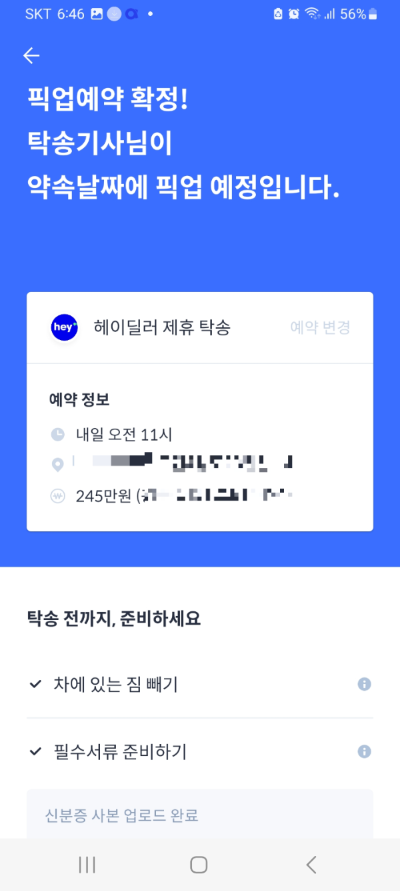 탁송기사님이 와서 자동차등록증과 차키를 건네주면 탁송기사님이 헤이딜러와 통화 후 차량대금이 곧바로 계좌로 들어옵니다.