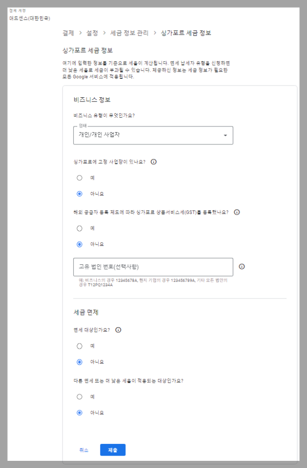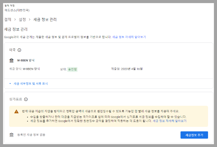 구글 애드센스 지급정보에 들어가니 미국 세금정보에 이어 싱가포르 세금정보 추가하라고 떠있네요.