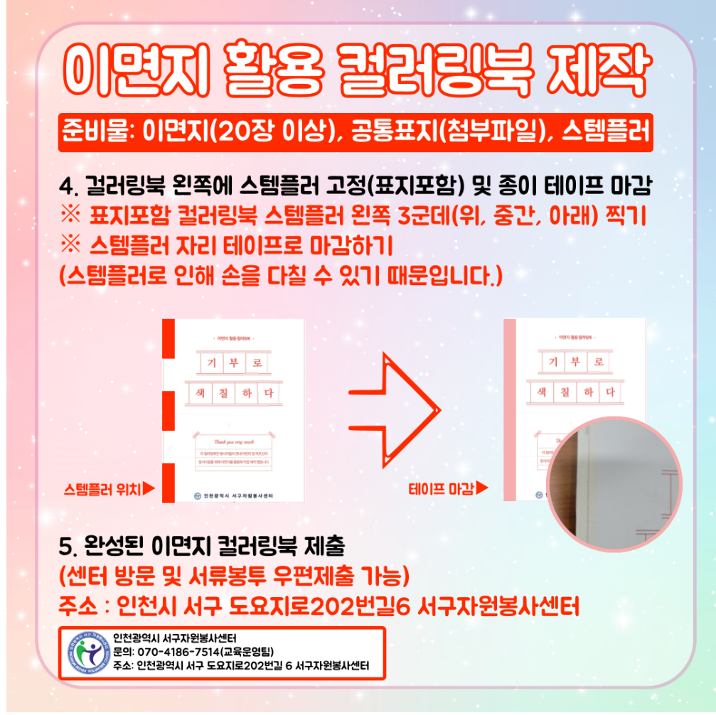 인천광역시 서구자원봉사센터에서 이면지를 활용해 컬러링북으로 제작 후 제출하는 봉사활동입니다.
