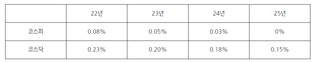 현재 코스피 · 코스닥 시장에서 증권거래세율은 농어촌특별세 포함 0.18%가 적용되고 있으며 2025년부터 0.15%로 인하될 예정입니다.