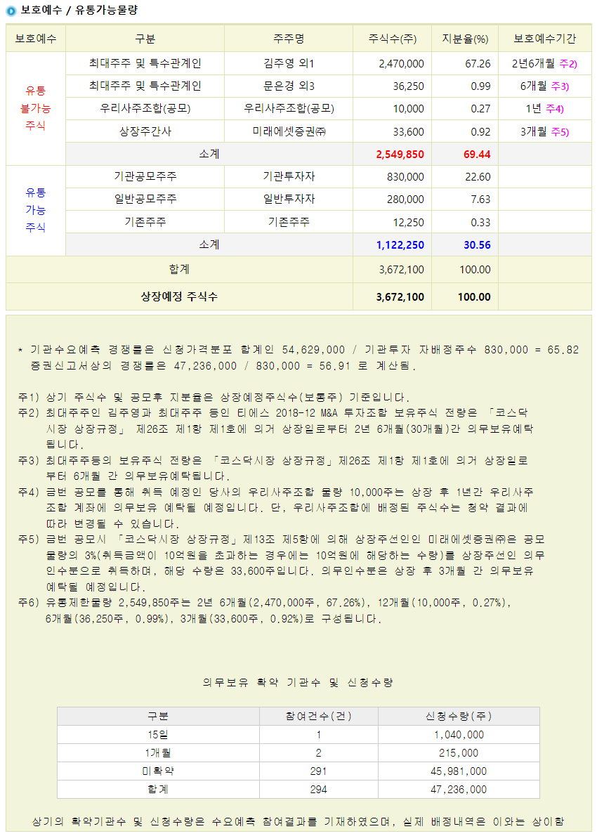 수요예측에서 기관들의 의무보유확약비율은 294건중 291건이 미확약으로 아주 좋지 않네요.