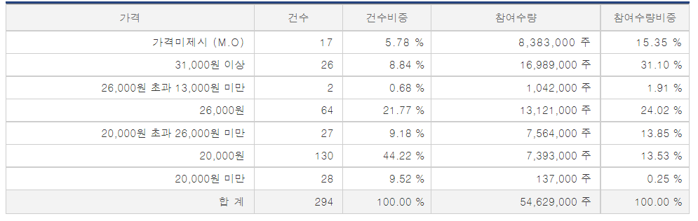 국내외 294개 기관이 참여하여 신청수량 기준 28%가 희망 가격의 하단보다 낮은 가격을 제시하여 최종 공모가는 2만원으로 확정됐고요.
