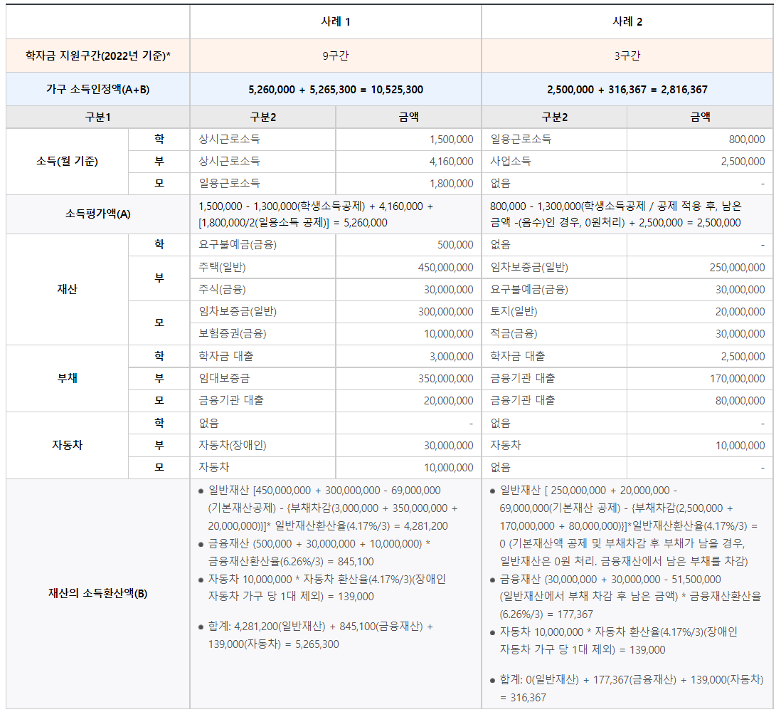 | 소득공제 | 신청인(학생)의 근로사업소득은 130만원 정액공제 신청인(학생) 및 가구원의 일용근로소득은 50% 정률공제 (단, 신청인(학생)은 정액공제금액과 정률공제금액중 큰 금액을 적용) |