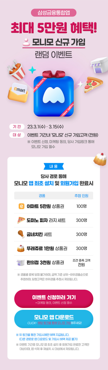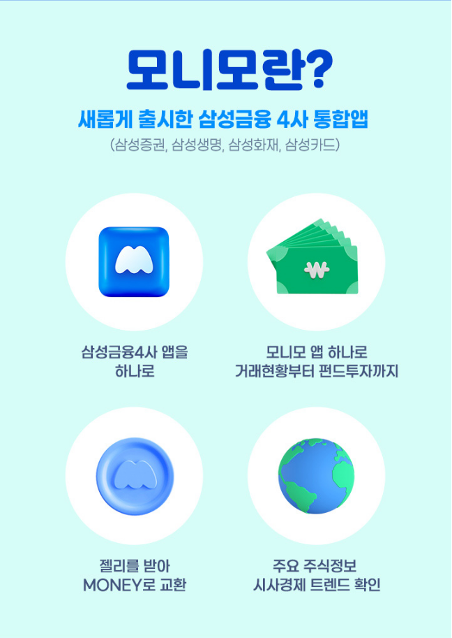 모니모는 삼성증권, 삼성생명, 삼성화재, 삼성카드의 통합앱입니다.