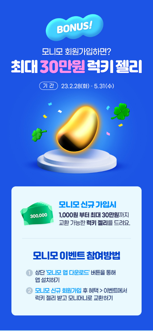 모니모 신규회원 가입후 이벤트 참여하면 럭키 젤리 받고 모니머니로 교환할 수 있습니다.