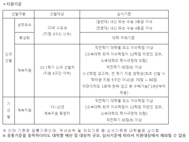 (C학점 경고제 : 직전학기 성적 기준으로 최대지원 횟수 내에서 70점 이상 ~ 80점 미만인 경우도 2회에 한해 경고 후 수혜 가능 (이수학점 기준은 기존과 동일), 적용 학기는 학생 또는 대학이 임의 선택 불가)