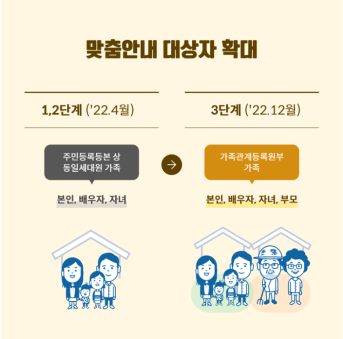 맞춤안내 대상자 확대로 주민등록등본 상 동일세대원 가족에서 가족관계등록원부 가족으로 확대되었습니다.
